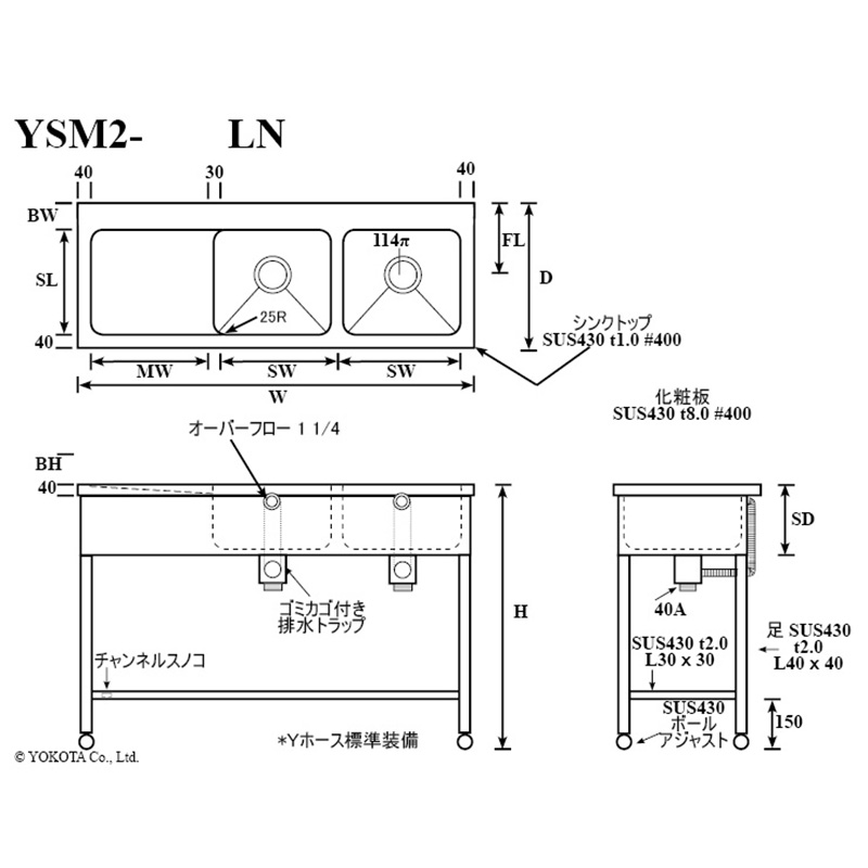 二槽シンク 水切付 アングルレッグ