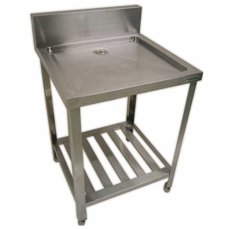 業務用水切台 バックガード付き。壁際設置に最適なバックガード付きモデル。SUS430ステンレス製で、飲食店や施設での調理作業に適しています。サイズバリエーション豊富で、設置スペースに合わせてお選びいただけます。