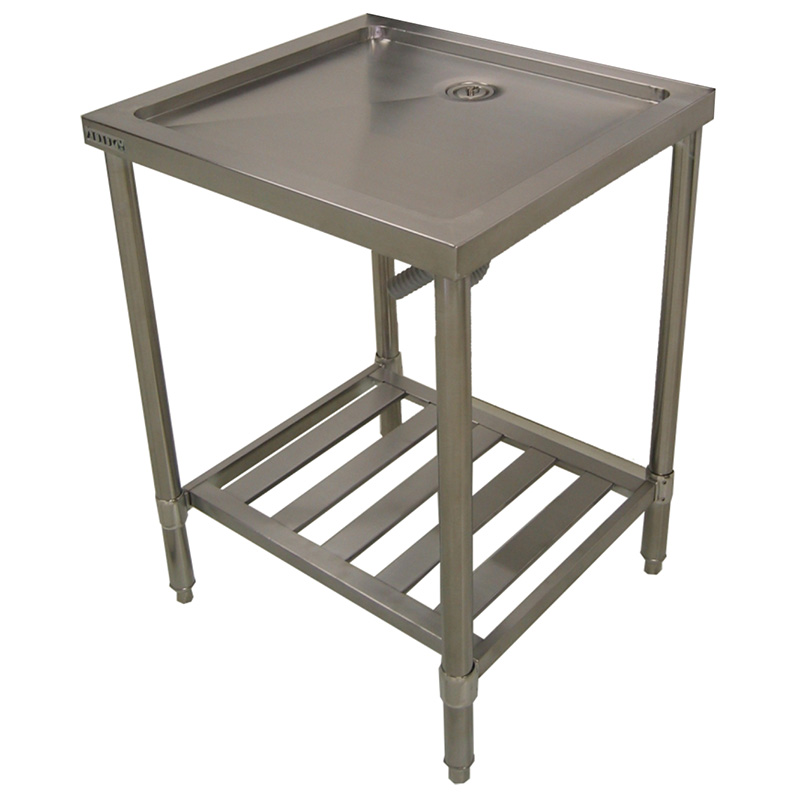 業務用水切台。すっきりとしたデザインで、中央設置や広いスペースでの使用に最適。パイプ脚タイプで安定性に優れています。SUS430ステンレス製で、飲食店や施設での調理作業に適しています。サイズバリエーション豊富で、設置スペースに合わせてお選びいただけます。