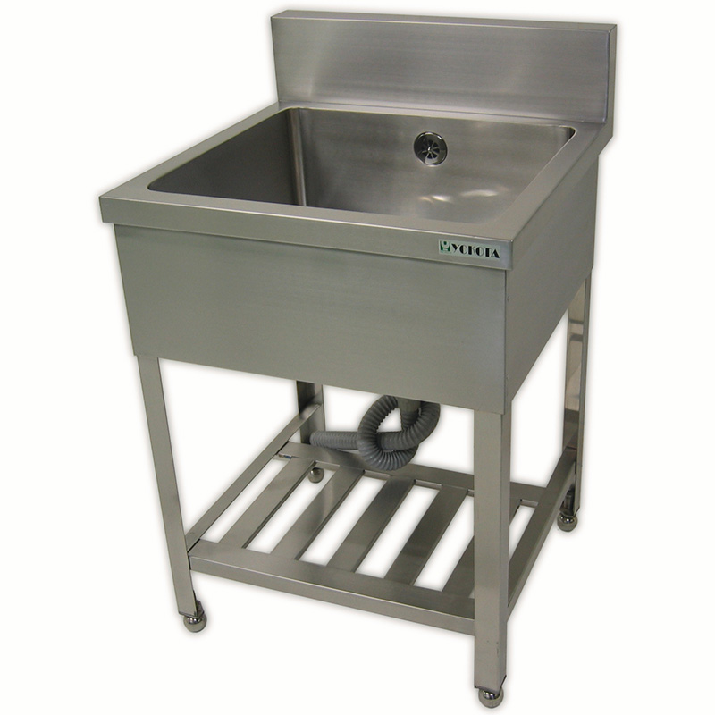 業務用一槽シンク。バックガード付きで壁際設置に最適。SUS430ステンレス製で耐久性に優れ、飲食店や施設での使用に適しています。サイズバリエーション豊富で、設置スペースに合わせてお選びいただけます。