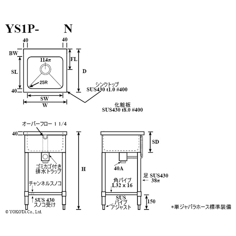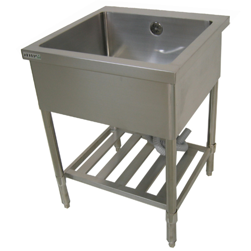 業務用一槽シンク パイプレッグ。バックガード無しで中央設置や作業島に最適。パイプレッグタイプで安定性と耐久性に優れています。SUS430ステンレス製で、飲食店や施設での調理・洗浄作業に適しています。サイズバリエーション豊富で、設置スペースに合わせてお選びいただけます。