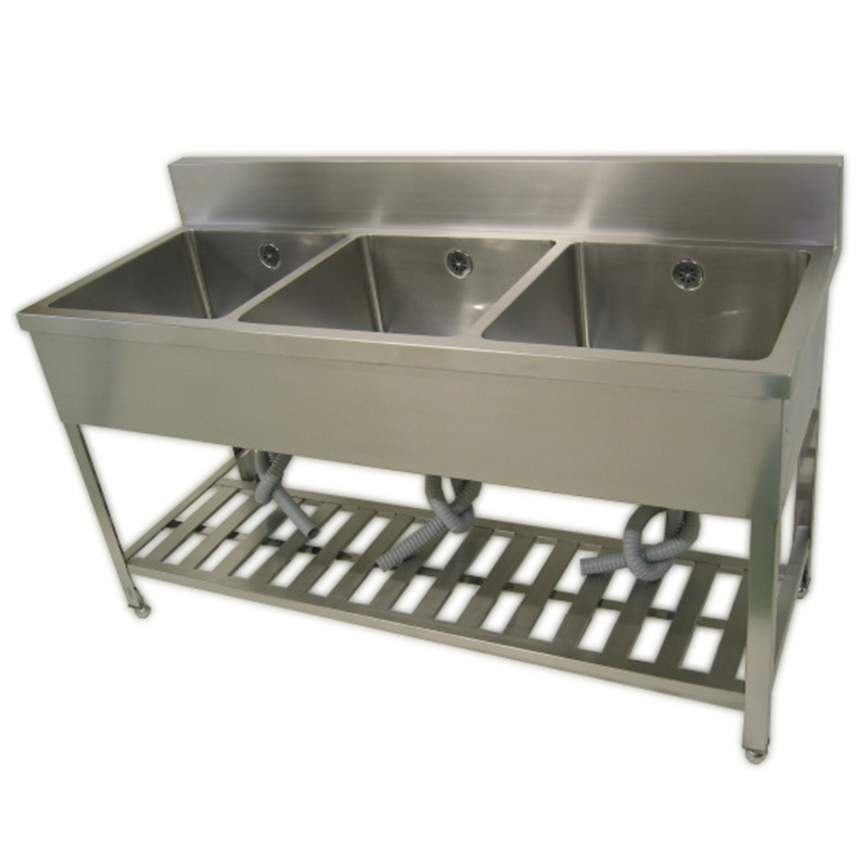 ステンレス製三槽シンク。バックガード有り。7サイズをご用意。